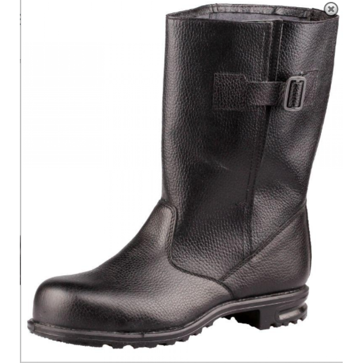 Сапоги рабочие от воздействия электрической дуги, искр и брызг расплавленного металла из натуральной кожи с глухим клапаном с поликарбонатным подноском на подошве из нитрильной резины.