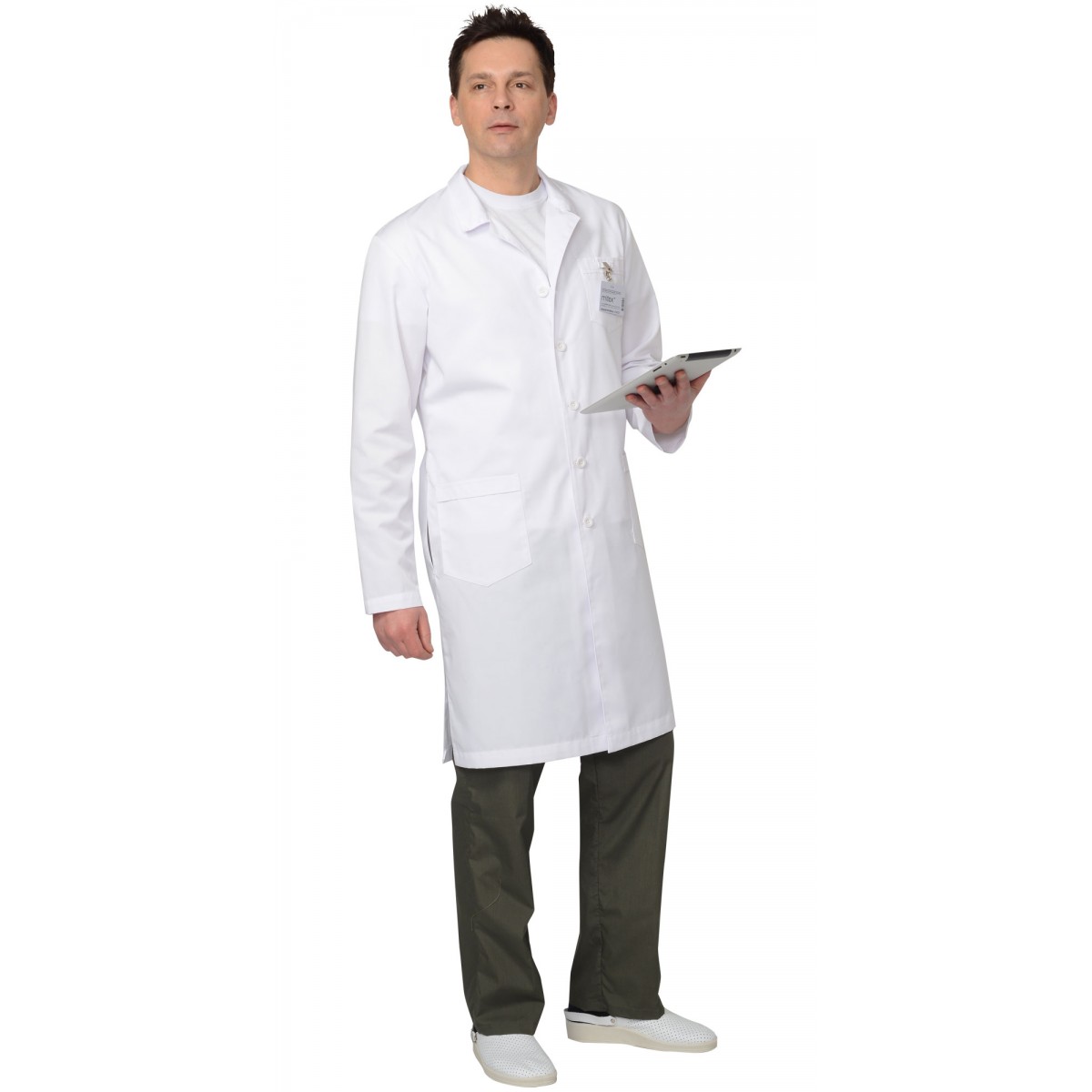 Халат мужской предназначен для медицинского персонала. Халат прямого силуэта, с центральной бортовой застежкой на пять петель и пуговиц, с отложным воротником и лацканом, с втачными длинными рукавами, с верхним нагрудным карманом на левой полочке и двумя нижними накладными карманами, по линии талии на спинке хлястик на пряжке и пуговицах. Халат с боковыми разрезами. Особенностью модели являются разрезы в боковых швах для свободного проникновения рук в брючные карманы.