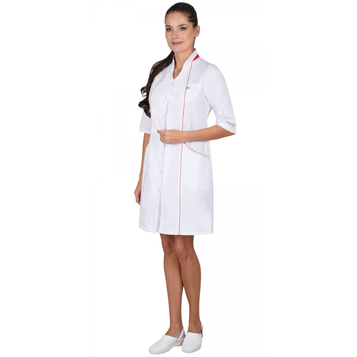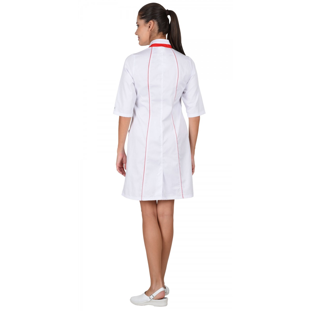 Халат полуприлигающего силуэта, с центральной застежкой на кнопки с верхними и нижними фугурными карманами. Воротник-стойка, в рельефных швах халата отделочный кант. Рукава 3/4.