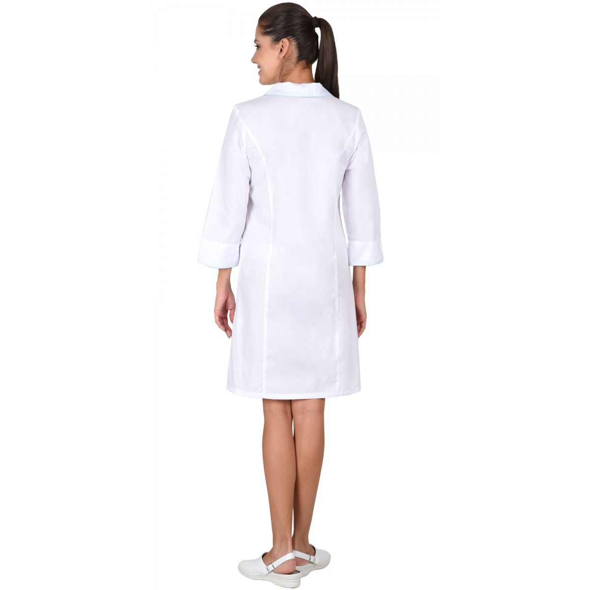 Халат с центральной застежкой на пуговицы. На полочках вертикальные рельефы. Фигурные карманы, воротник и манжеты с отделкой в виде канта контрастного цвета. Рукава 3/4.