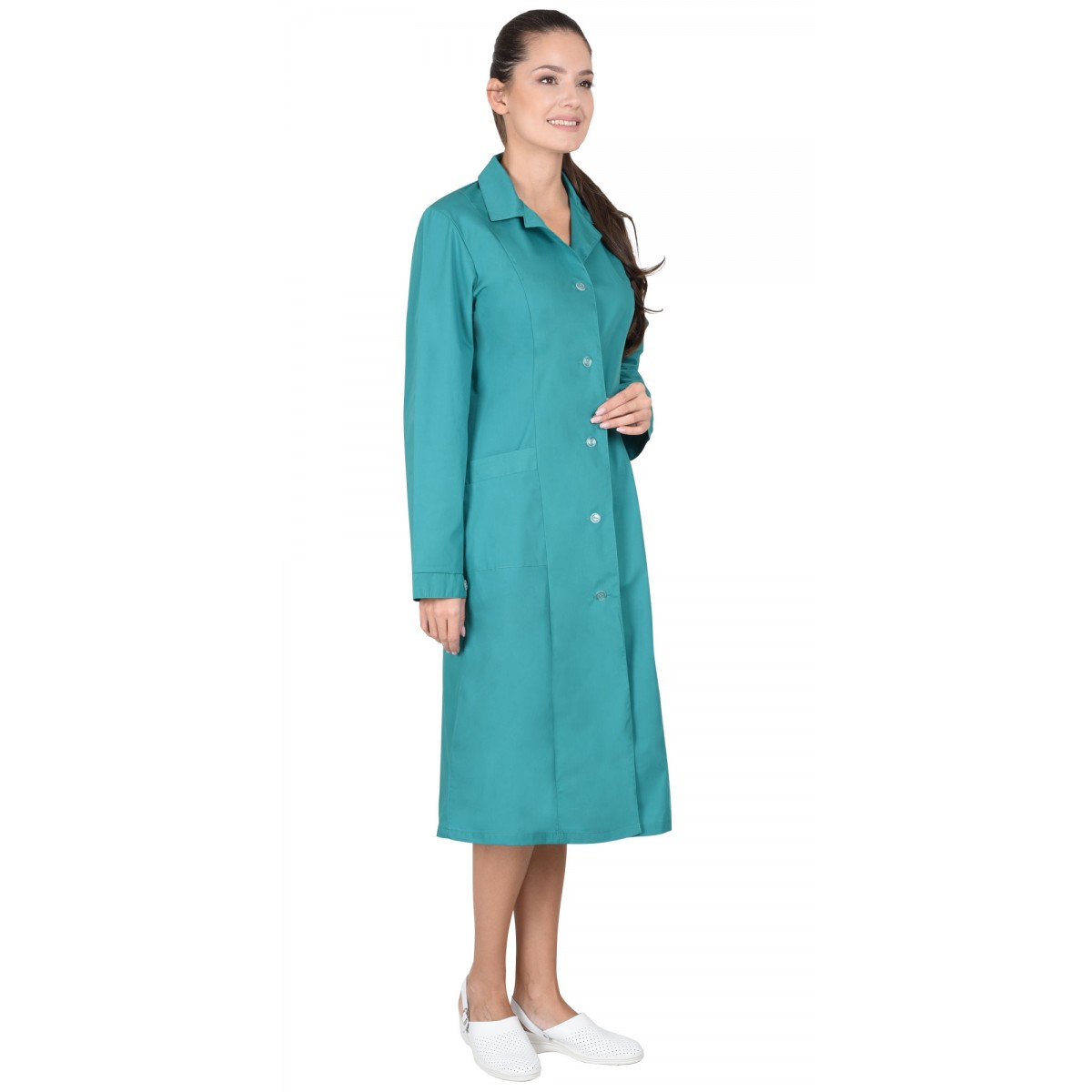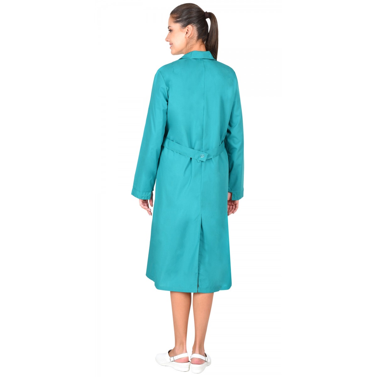 Классическая модель с нагрудным и двумя нижними накладными карманами, отложным воротником и длинными рукавами с манжетами. Ширина халата по линии талии регулируется хлястиком.