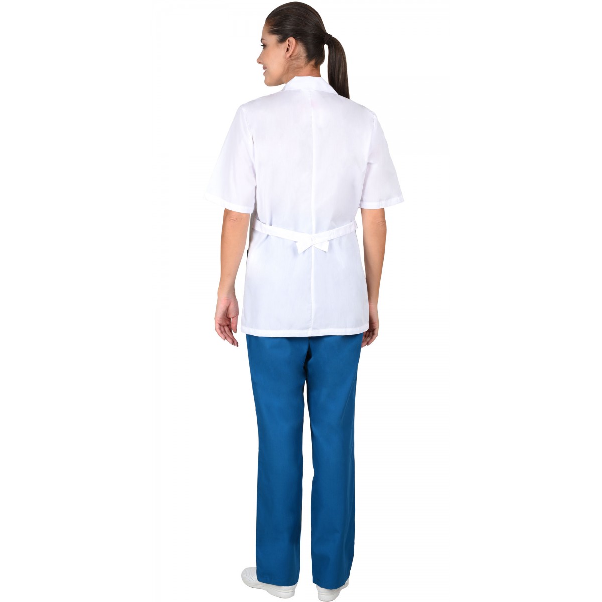 Костюм состоит из блузы и брюк. Блуза прямого силуэта с фигурной отделкой на лацканах и карманах. Ширина по линии талии регулируется хлястиком. Брюки свободного покроя на резинке