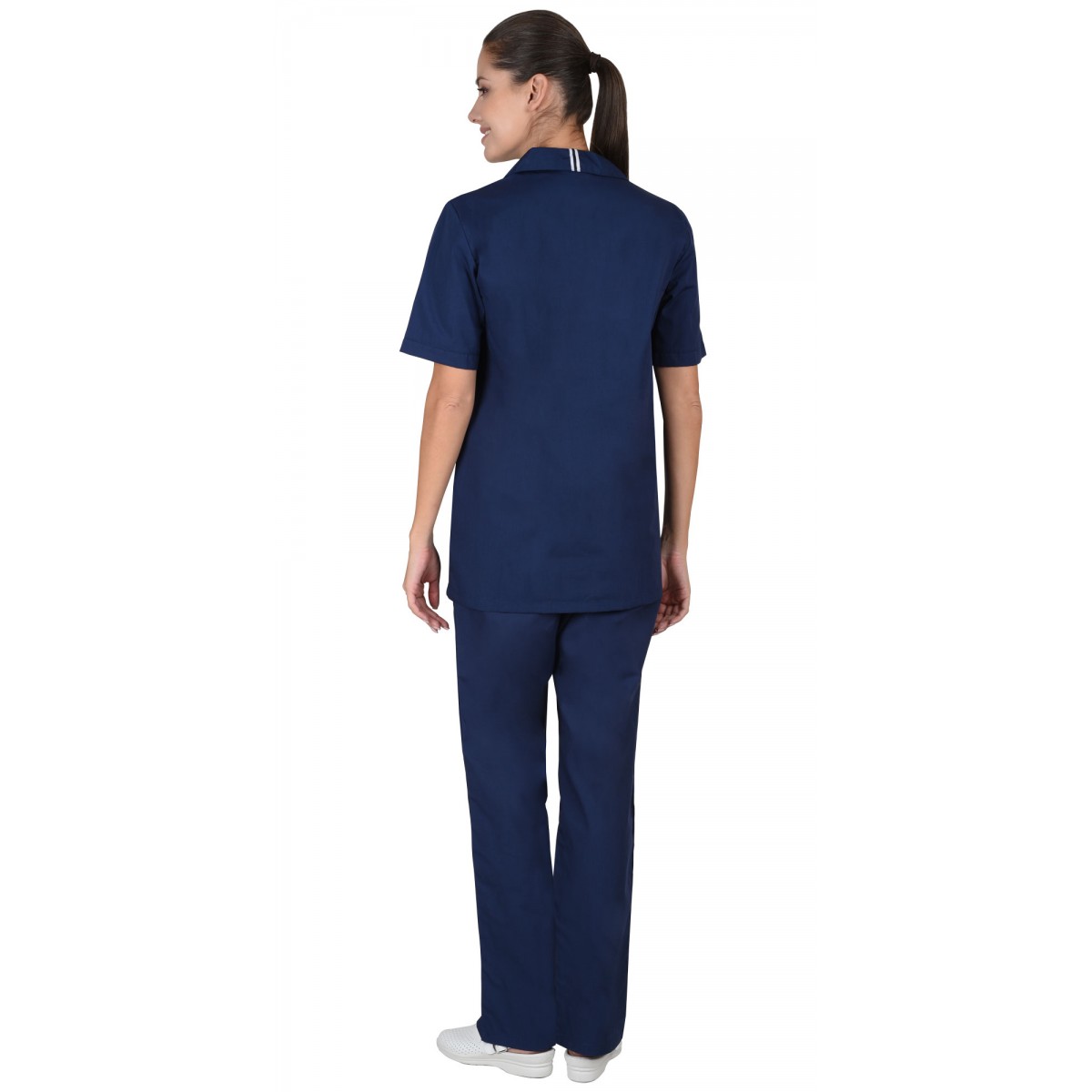 Костюм состоит из блузы и брюк. Блуза прямого силуэта с застежкой на тесьму "молния" в области кокетки. Отложной воротник. Нагрудный левый и два нижних накладных кармана. Рукава втачные, короткие. По низу блузы разрезы в боковых швах.