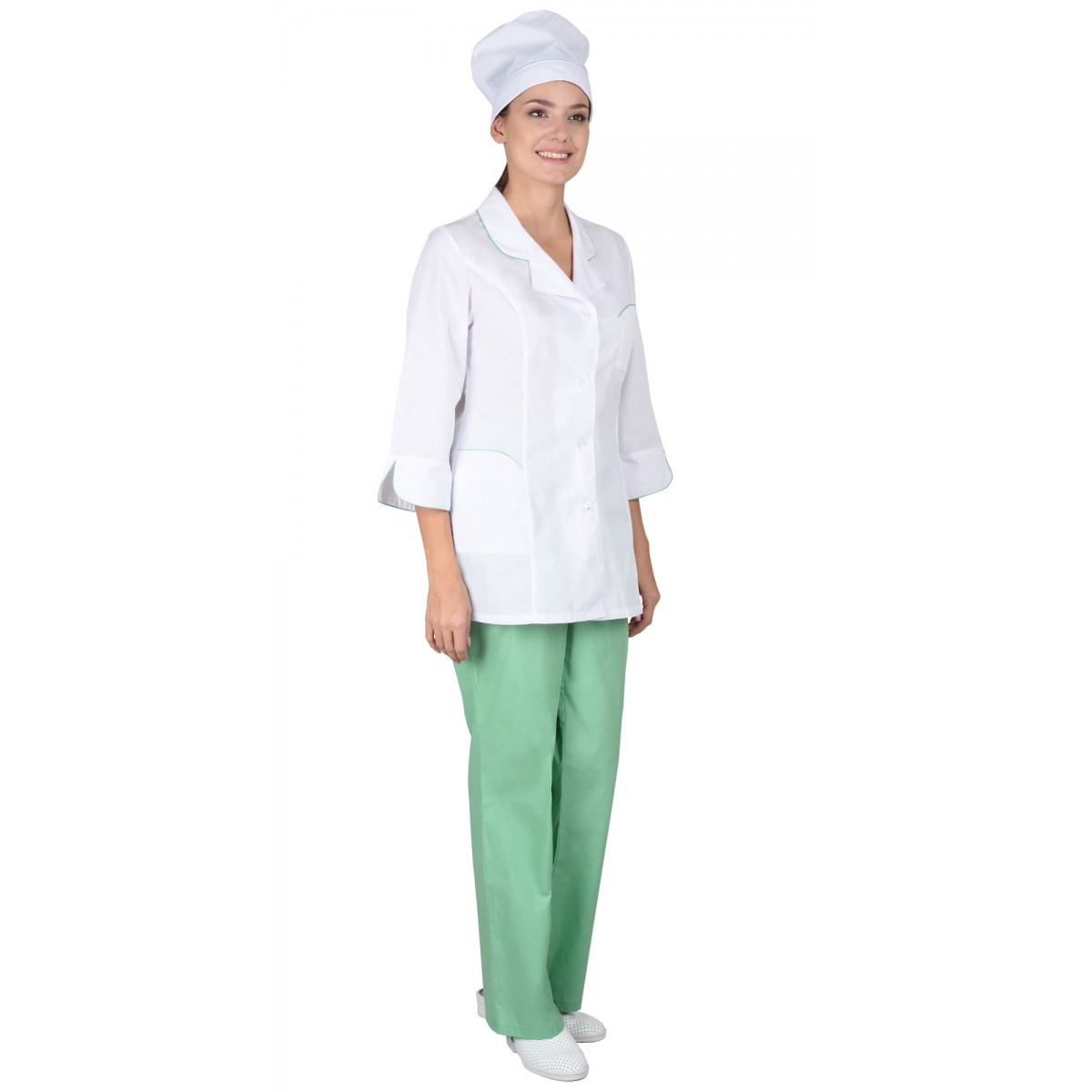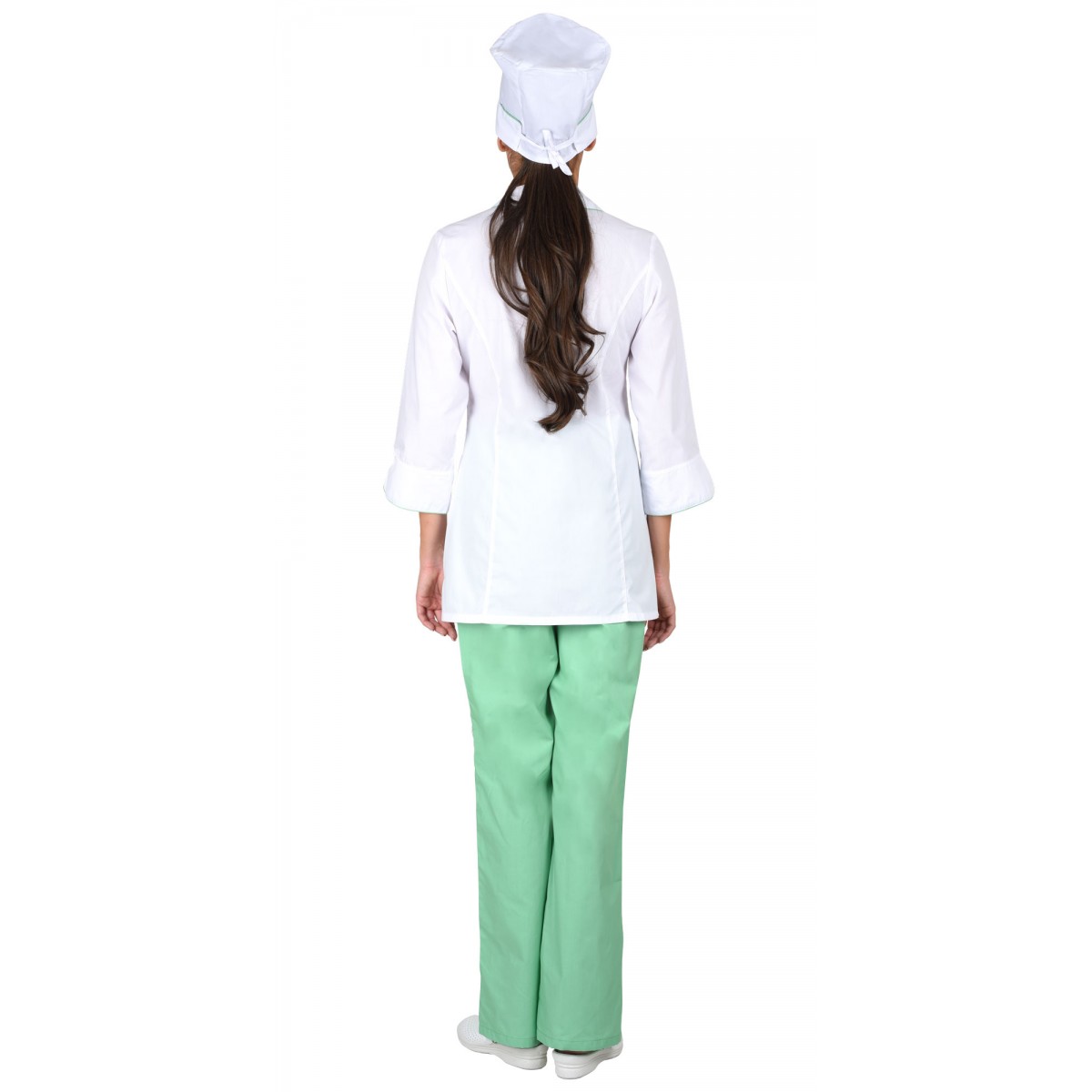 Костюм состоит из блузы, брюк и колпака. Блуза полуприлегающего силуэта с центральной застежкой на пуговицы. На полочках вертикальные рельефы. Фигурные карманы, воротник и манжеты с отделкой в виде канта контрастного цвета. Рукава 3/4. Брюки свободного покроя на резинке. Колпак с фигурной отделкой.