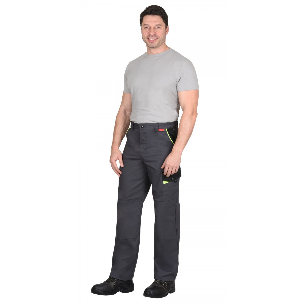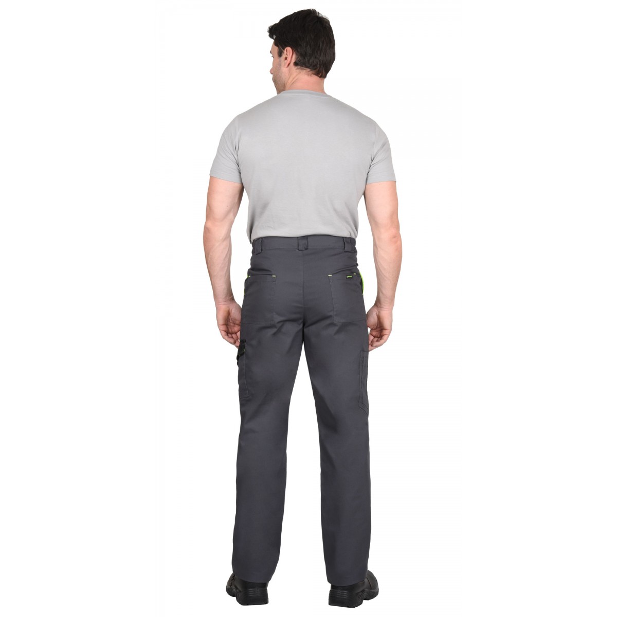 Брюки прямые, с застёжкой спереди на тесьму «молния», с притачным поясом, с частичной стяжкой по бокам и заст.гивающимся на 1 петлю и 1пуговицу, с 5 шлевками, с внутренними боковыми карманами и наколенниками, с накладным карманом на левом боковом шве с клапаном с патой на кнопке, с двумя задними накладными карманами и карманами для инструментов.