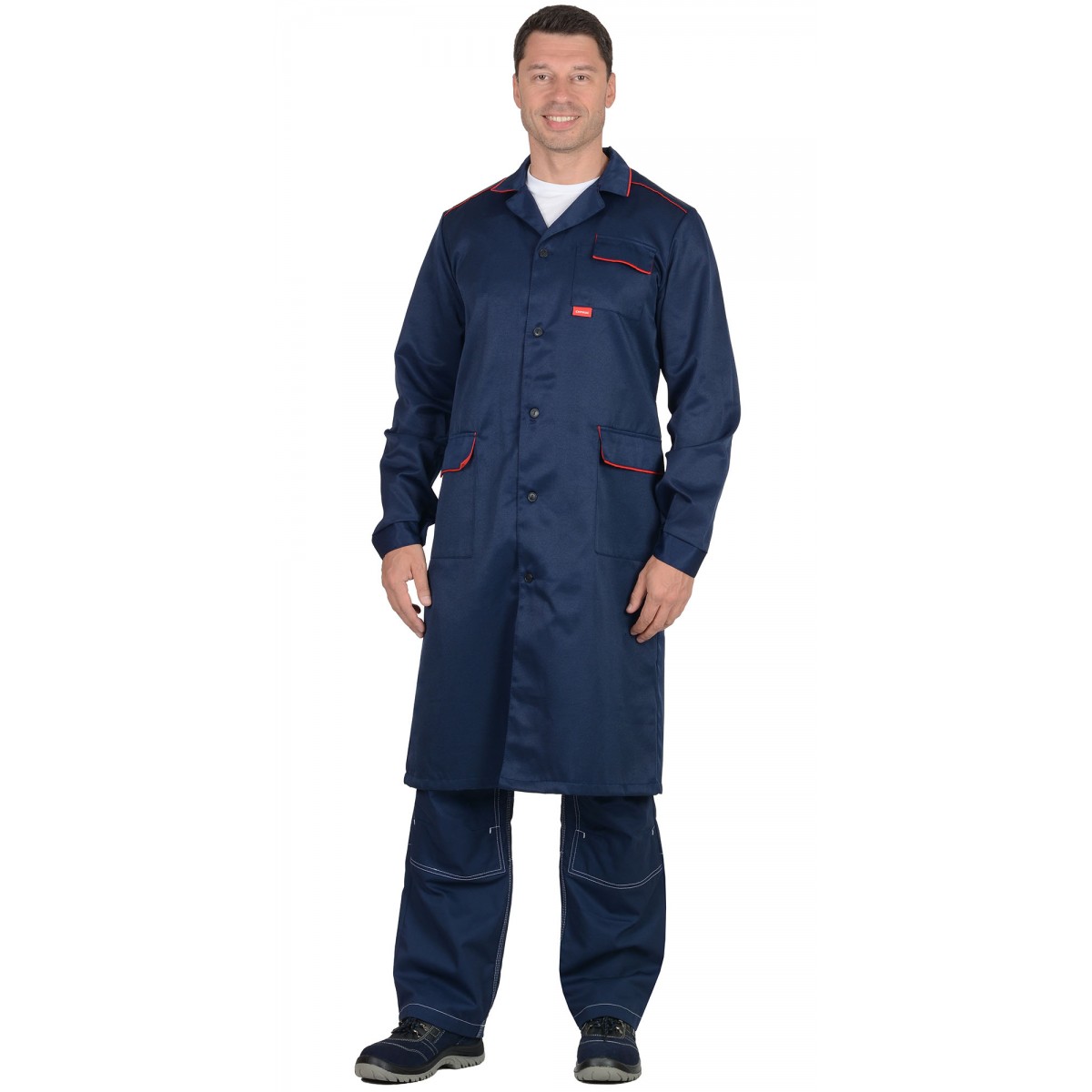 Халат с центральной потайной застёжкой на 5шт. обметанных петель и 5шт. пуговиц; с воротником пиджачного типа; с левым нагрудным накладным карманом с фигурным клапаном; нижними накладными карманами с фигурными клапанами, с разрезами понизу в боковых швах. Рукава втачные двухшовные с притачными манжетами.