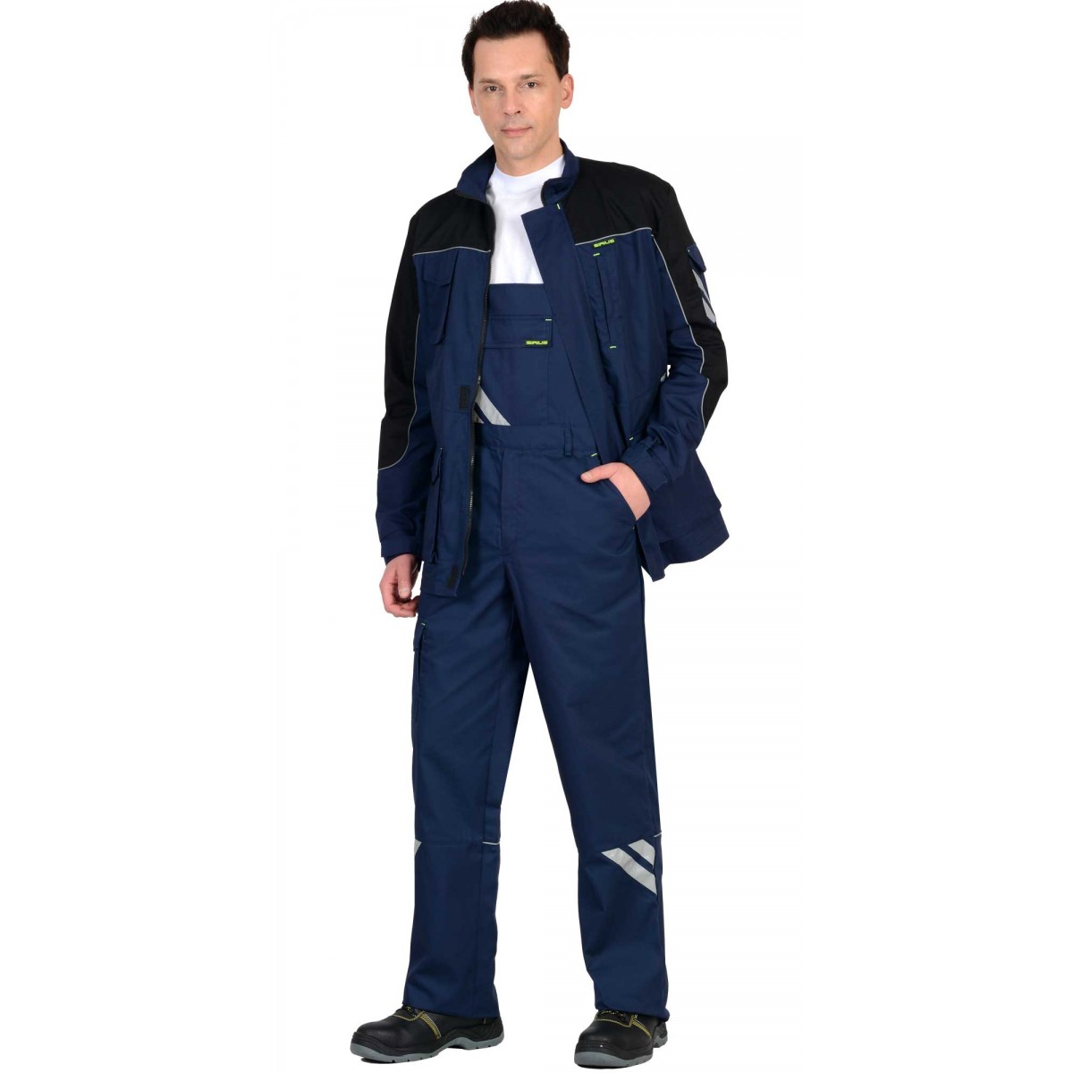 Полукомбинезон застежкой гульфика на тесьму - "молния" с боковой застежкой на пуговицы, с различными функциональными карманами, с элементами из СВ кант и СОП, обеспечивающие безопасность работы в условиях пониженной видимости.