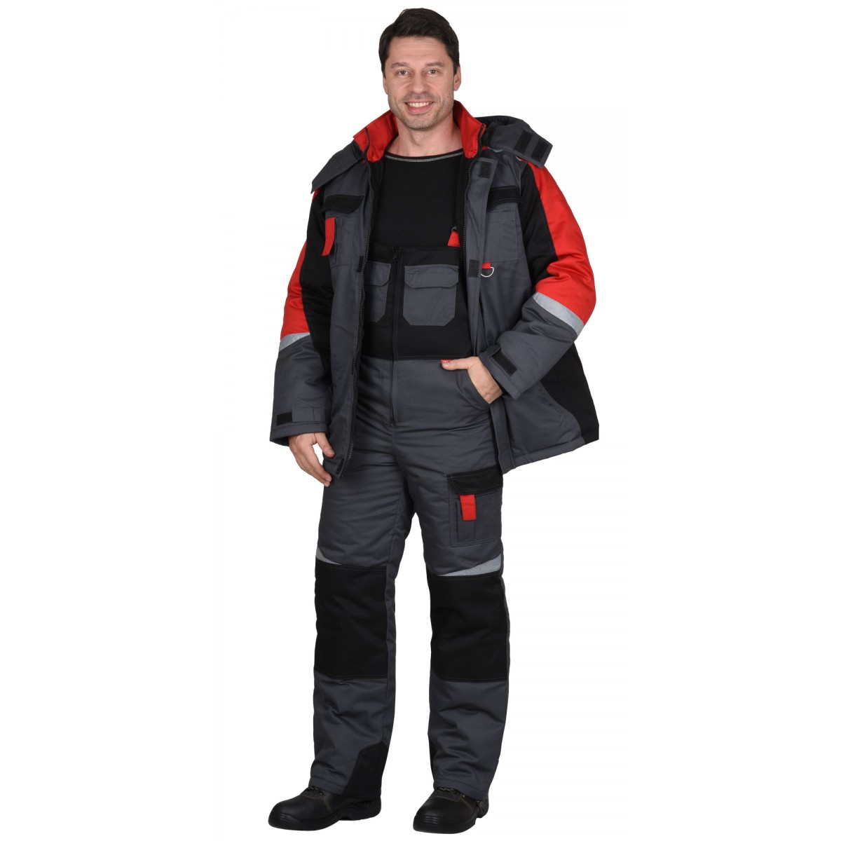Полукомбинезон с притачной утеплённой подкладкой, с центральной потайной застёжкой на 2-х замковую тесьму "молнию", верхними накладными карманами с клапаном и нижними внутренними боковыми карманами, с наколенниками, с многофункциональным накладным карманом на левом боковом шве с клапаном и патой на ленте "контакт". На задней правой половинке один верхний и 2 нижних кармана для инструмента, настроченные один на другой, также предусмотрена шлёвка для инструмента.