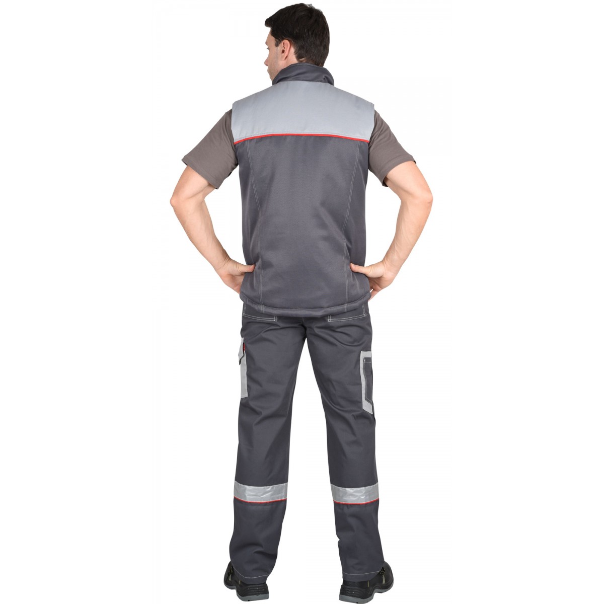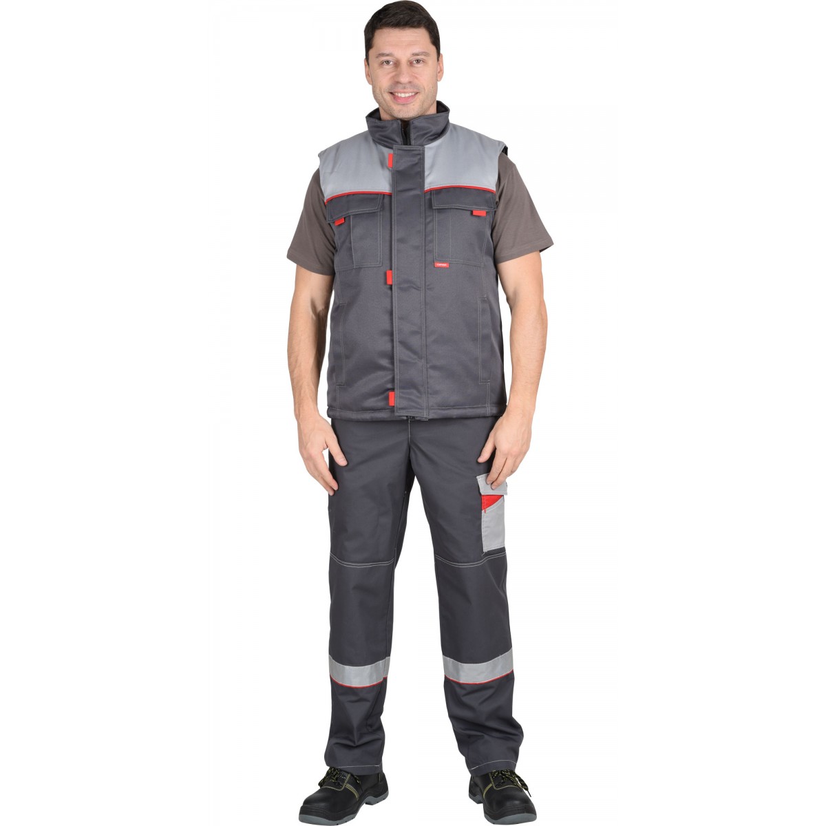Жилет утепленный, с центральной застёжкой на тесьму-«молнию», с ветрозащитной планкой, застегивающейся на потайные липучки, с верхними накладными карманами с клапанами, застегивающимися на потайную липучку длиной, с нижними карманами в рельефном шве, с внутренним карманом на молнии, с воротником-стойка, с фигурной линией низа по спинке.