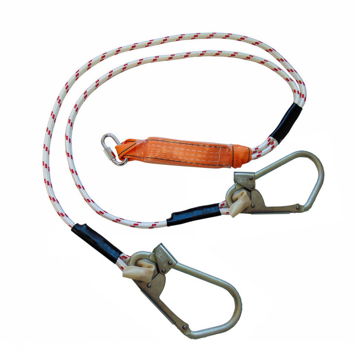 Строп из полиамидного каната с двумя  монтажными и одним соединительным карабинами, с амортизатором, двойной. Строп упакован в водонепроницаемый пакет и содержит паспорт и инструкцию по применению.